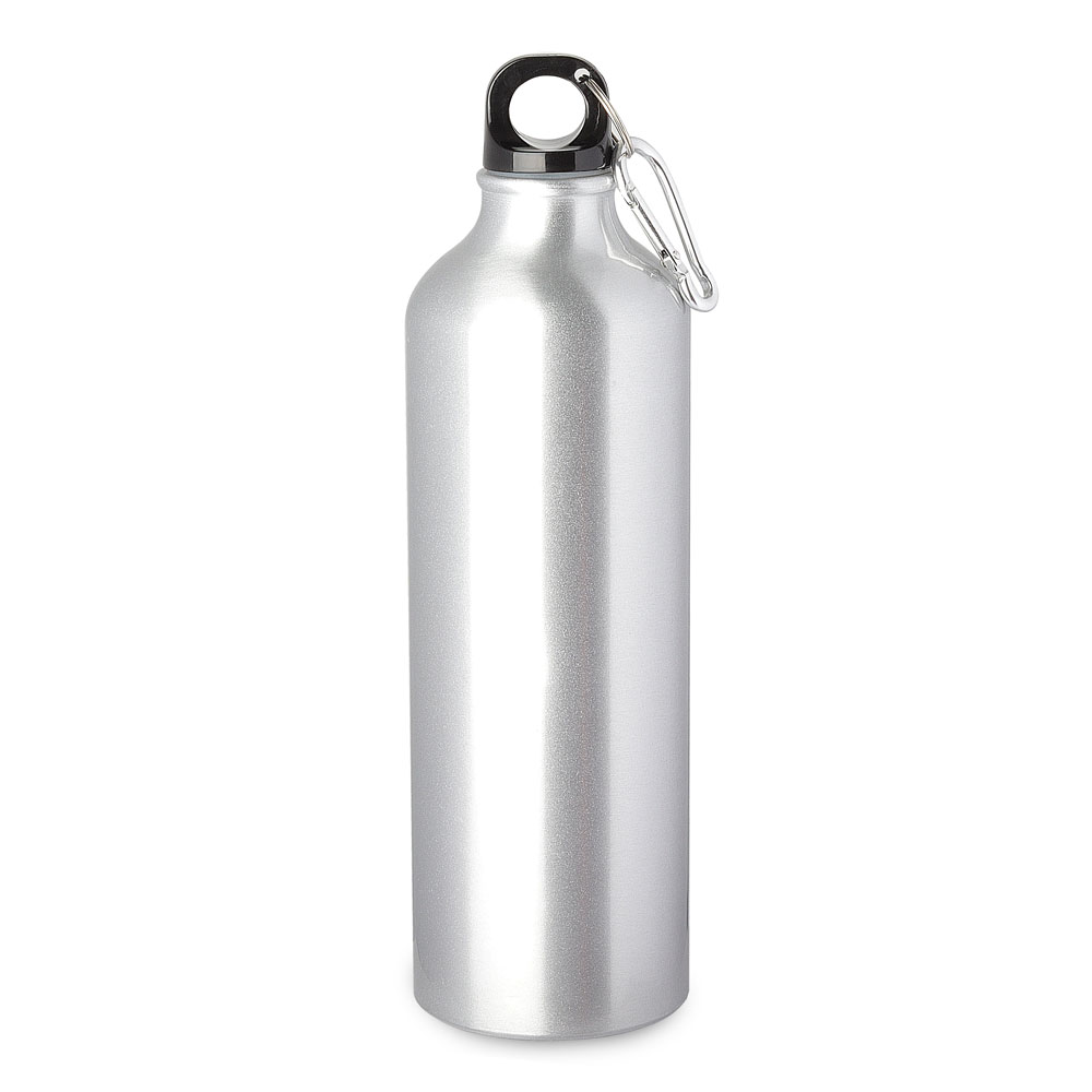 Garrafa em alumínio com capacidade de 750ml. Tampa de plástico rosqueável com mosquetão colorido. Pintura metálica.