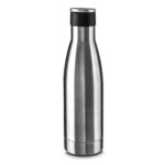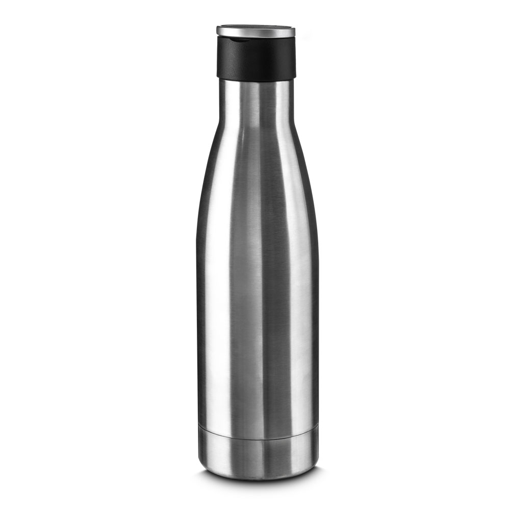 Garrafa térmica em aço inox isolada a vácuo com parede dupla com capacidade de 500ml. Tampa de plástico com alça de transporte de aço inoxidável.