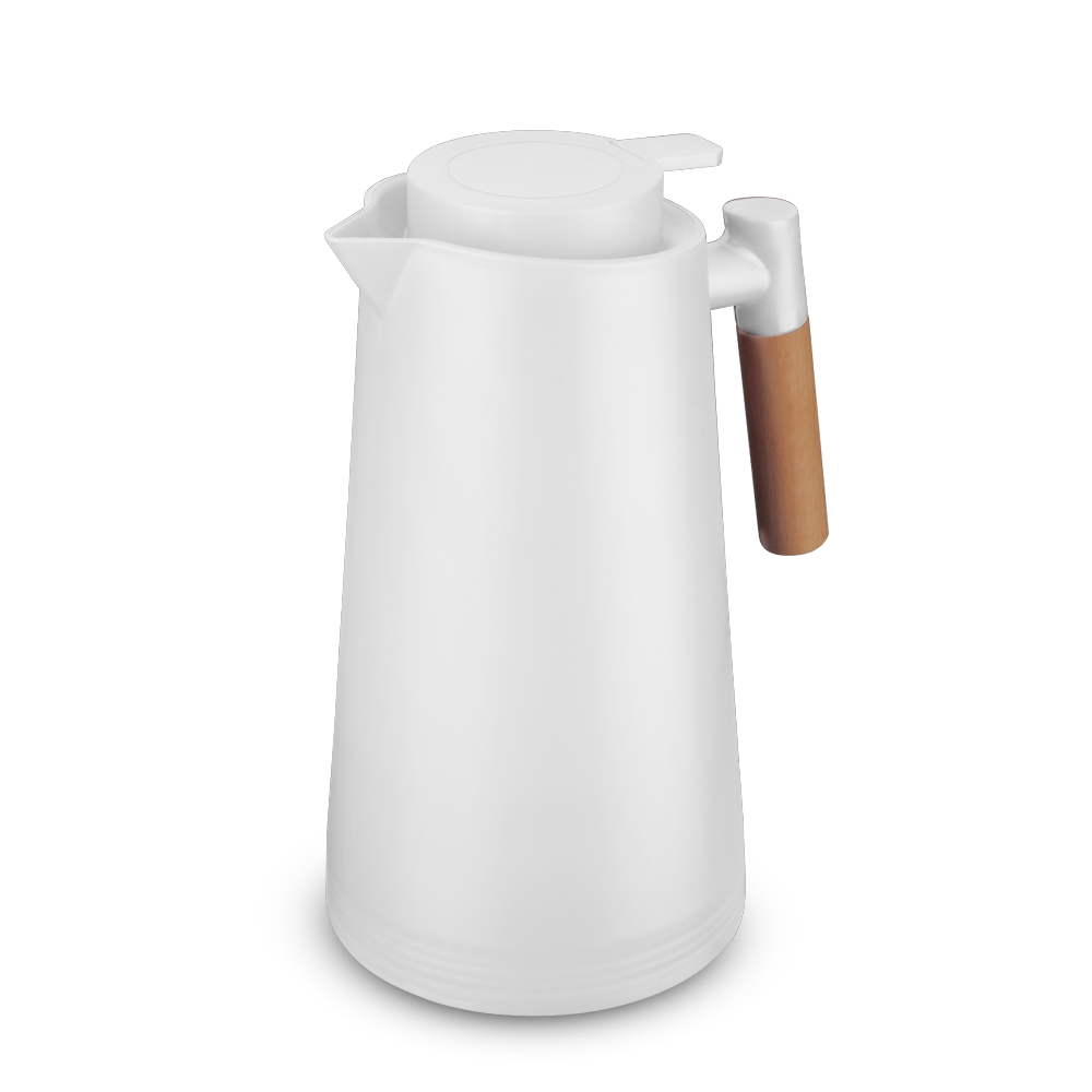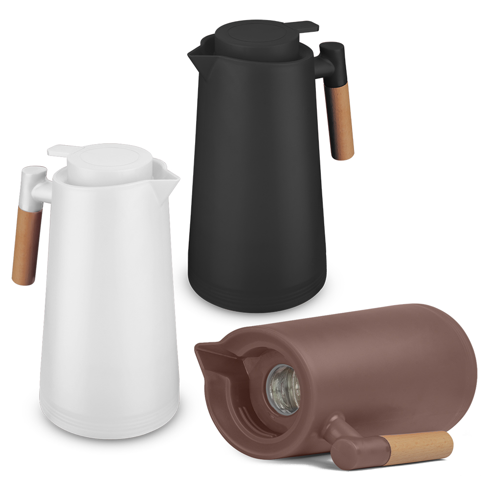 Garrafa Térmica de Plástico PP (exterior) com parede dupla de ampola de vidro (interior), com capacidade de até 1l. Alça de transporte lateral em madeira. Tampa rosqueável em plástico com anel de silicone para vedação. Conta com um sistema corta-pingo.