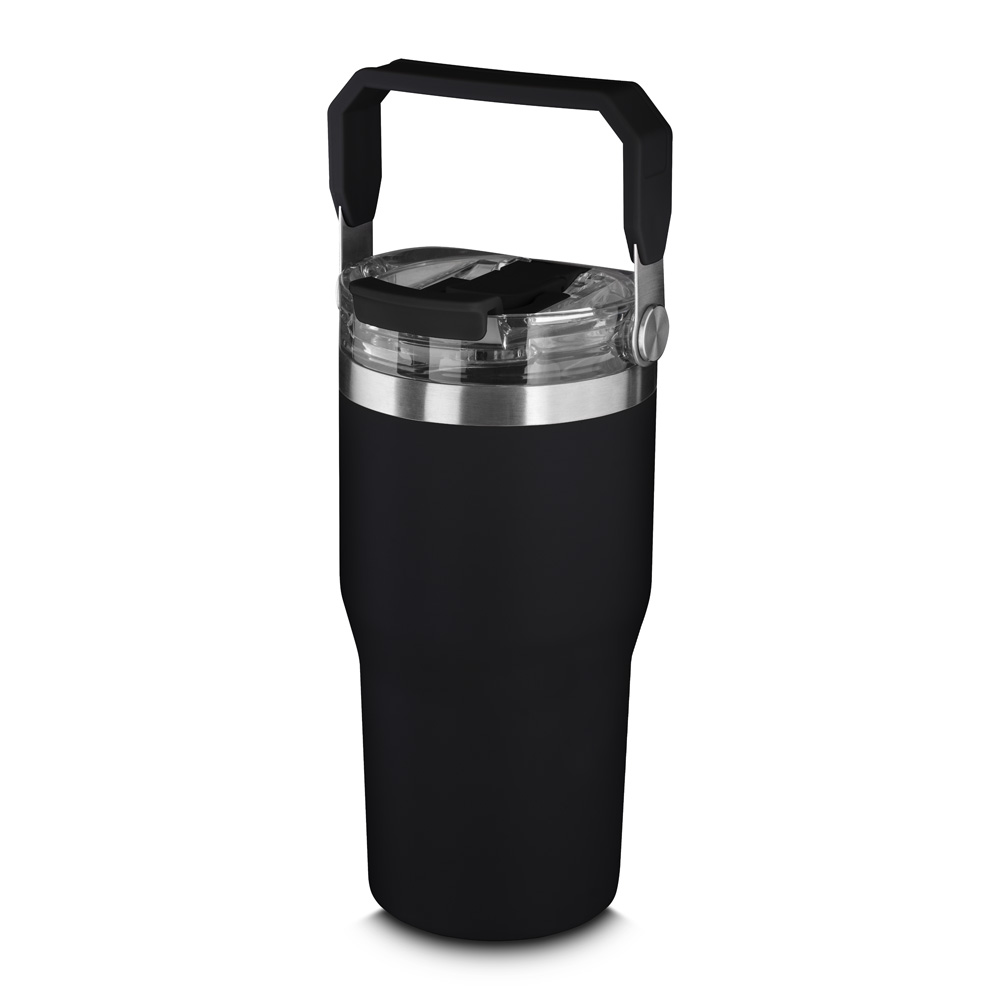 Garrafa térmica em aço inox com parede dupla com capacidade de até 650ml, parede externa com pintura a pó. Tampa rosqueável com anel de silicone para vedação. Alça de transporte em plástico. Permite-se hidratar por canudo ou bico.