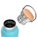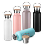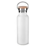 Garrafa térmica em aço inox com parede dupla isolada a vácuo, com capacidade de até 500ml. Tampa rosqueável com revestimento em fibra de bambu. Alça em metal. Detalhe cromado. Pintura fosca.