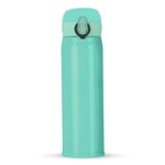 Garrafa térmica de 400ml de inox colorida com botão e válvula para abertura. Possui um sistema de trava (basta mover para cima/baixo para abrir/fechar), pressione o botão central para abrir a tampa(possui na parte interna borracha protetora evitando vazar o líquido). Para abrir a tampa por completo basta rosqueá-la, parte interna revestida em inox. Na embalagem do produto pode ir especificado a capacidade de 450ml ou 500ml devido aos fabricantes que trabalham terem impresso a descrição deste modo, porém ressalvamos a capacidade correta de 400ml.
