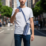 Garrafa térmica em aço inox com parede dupla isolada a vácuo e capacidade de 500ml. Alça de transporte em cordão. Tampa rosqueável, vedada por um anel de silicone e com uma argola tipo mosquetão para o cordão. Parte superior da tampa possui um compartimento para pequenos objetos que acompanha um cordão adicional de 68cm para substituição e cordão de mão com 10cm. Possui copo adicional rosqueável na parte inferior da garrafa de 250ml. Pintura fosca.