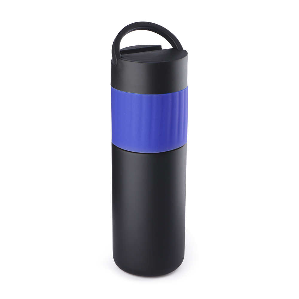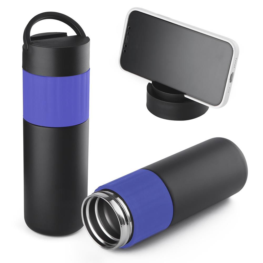 Garrafa térmica em aço inox com parede dupla isolada a vácuo, com capacidade de até 500ml. Conserva a temperatura quente ou fria, com alça e suporte para celular na tampa. Apoio para mão emborrachado e tampa rosqueável com anel de silicone para vedação.