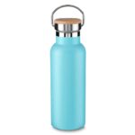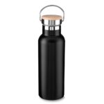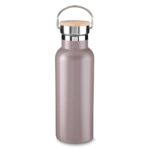 Garrafa térmica em inox 500 ml, tampa rosqueável com revestimento em fibra de bambu, alça de metal.