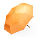 Guarda-chuva manual de nylon com impacto impermeável e proteção UV, tecido interno em vinil. Com 8 varetas e estrutura em aço, possui botão de abertura e pegador de madeira com alça de nylon. Acompanha capa protetora.