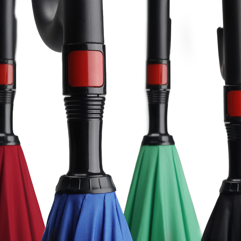 Guarda-chuva invertido com cabo plástico e haste de metal, botão acionador para abertura automática, tecido ponge chinês, seda crua Poliester 190T Pongee, oito varetas.