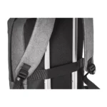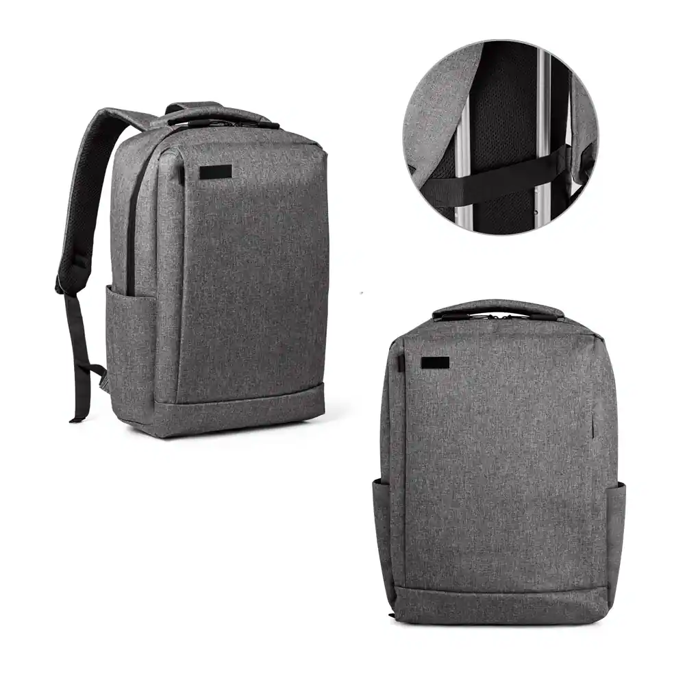 Mochila para notebook em 300D de alta densidade com 2 divisórias almofadadas para notebook até 15.6″ e tablet 10.5″ e diversos bolsos interiores. Tem ainda bolso frontal, 2 bolsos laterais e banda para transporte em trolley. Parte posterior e alças são almofadadas. Placa metálica removível com imã, para fácil gravação. Capacidade até 14 L. 320 x 410 x 120 mm