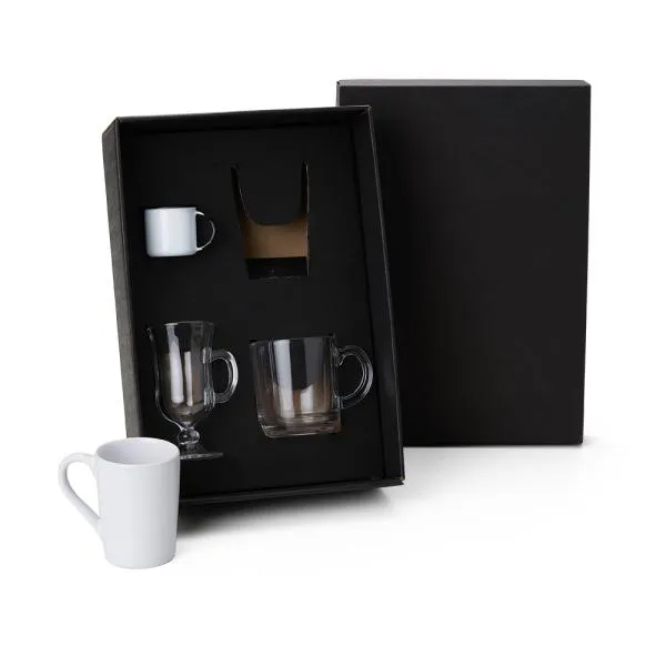 Conta com caneca em vidro com capacidade de 300ml, caneca de vidro p/ café com capacidade de 130ml, caneca em cerâmica branca com capacidade de 230 ml e caneca em alumínio branca.
