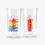 Jogo de copos personalizados contendo dois copos Coca Cola Summer em vidro.