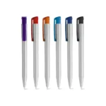 Esferográfica em ABS com acabamento metalizado e clipe translúcido colorido. Até 1.5 km de escrita. ø11 x 136 mm