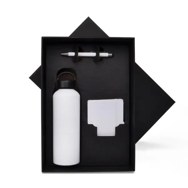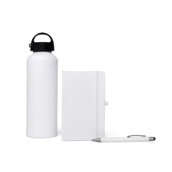 Conta com garrafa branca em alumínio com capacidade de 600 ml; caderno para anotações branco com capa dura e caneta esferográfica em alumínio branca.