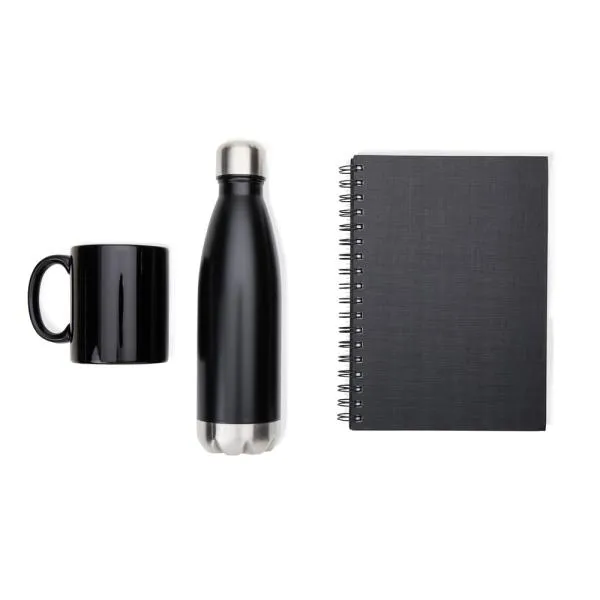 Conta com squeeze em aço inox preto, caneca em cerâmica preta e caderno preto.