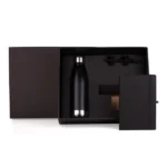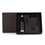 Kit composto por garrafa em aço Inox preta com tampa rosqueável; caderno para anotações preto com capa dura e caneta esferográfica em ABS preta.