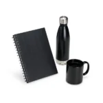 Conta com squeeze em aço inox preto, caneca em cerâmica preta e caderno preto.