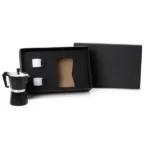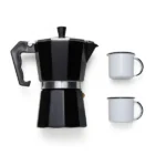 Esse kit conta com cafeteira modelo Italiana em alumínio de alta qualidade e resistência. Toda sua estrutura é desmontável e alça para garantir a segurança durante o seu uso e conta também com duas canecas em alumínio branco.