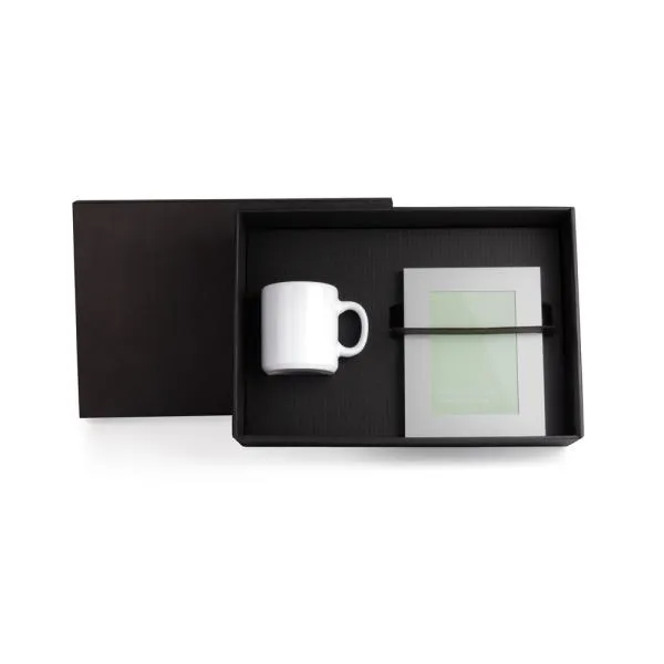Kit contendo caneca em cerâmica na cor branca com capacidade de 270 ml e porta-retrato em alumínio fosco com vidro frontal, apoio em polipropileno preto e uma fina espuma no interior para acomodar melhor a foto.