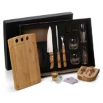 Kit para Churrasco, Drinks e Truco. Composto por tábua com três furos em Bambu; garfo trinchante e faca 8″; dois copos de Cerveja, dois copos de Whisky e dois copinhos de dose em vidro; caixa para truco com jogo de cartas, marcador de tentos e jogos em MDF.
