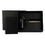 Kit composto por squeeze preto em alumínio revestido com verniz; caderno para anotações wire-o preto com capa dura revestida em percalux linho e caneta esferográfica em ABS preta.