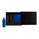 Composto por squeeze azul em alumínio revestido com verniz; caderno para anotações wire-o branco com capa dura revestida em percalux linho e caneta esferográfica em ABS azul.