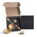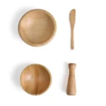 Conta com cumbuca redonda em bambu com capacidade de 200 ml e espátula, conta também com amassador de temperos. Estão perfeitamente acomodados em uma caixa para presentear.