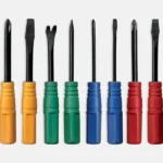 Kit composto por oito ferramentas em aço, sendo três chaves de fendas, quatro chaves philips e um extrator de pregos, todas com cabos em polipropileno, acomodados em um estojo com base preta e tampa em acrílico. Possui ainda um cabo para fixação das chaves e soquete em polipropileno adaptável para porcas borboletas.