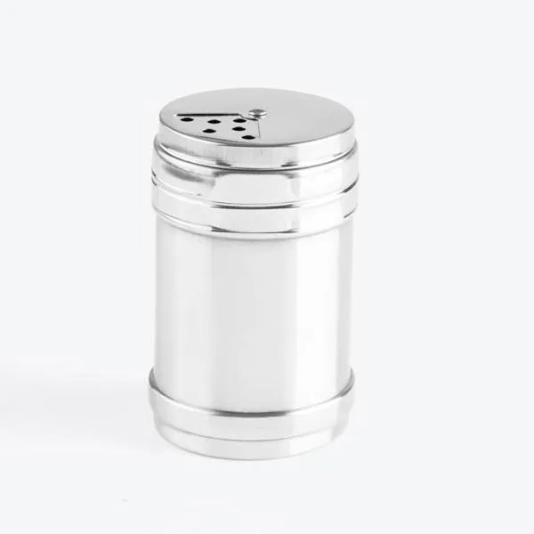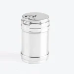 Kit contendo dois potes de aço inox para tempero com tampa giratória acomodados em uma embalagem para presente.