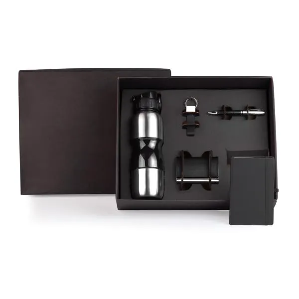 Kit escritório composto por squeeze fumê revestido em aço Inox 750ml; caderno para anotações preto com capa dura; caneta, porta-cartão e chaveiro em material sintético preto e metal cromado brilhante.