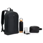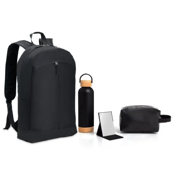 Composto por mochila preta confeccionada em Polyester 600D; necessaire com alça em material sintético na cor preta; garrafa com parede dupla em Inox na cor preta em metal e espelho portátil com acabamento aveludado preto.