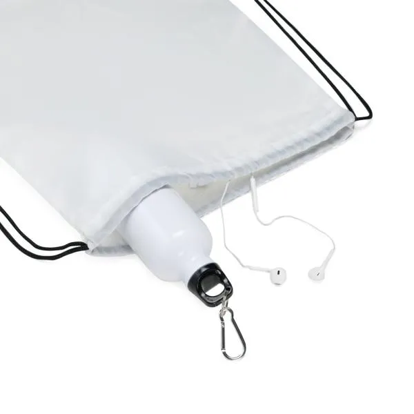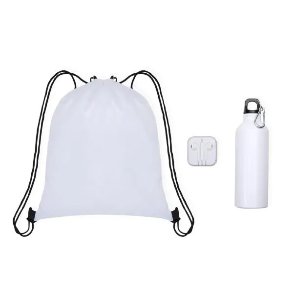 Kit fitness. Composto por mochila sacola em Nylon 420 branca; squeeze branca em alumínio; fone de ouvido branco com microfone, controle de volume e estojo plástico.