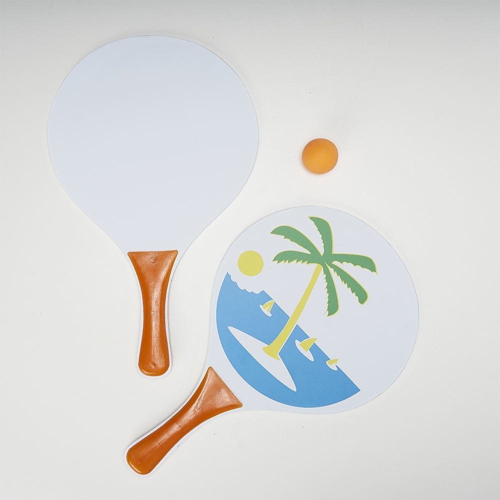 Kit frescobol em MDF com embalagem de malha plástica. Contém 2 raquetes de madeira com pegador de revestimento plástico e bolinha emborrachada.