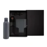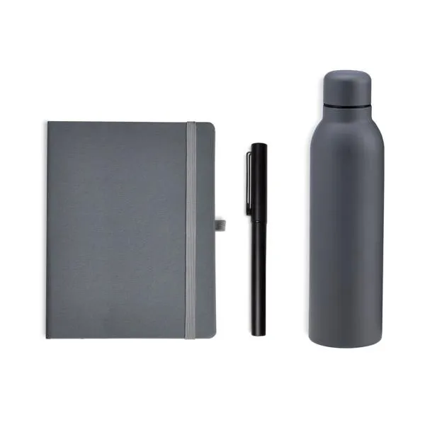 Composto por garrafa cinza em metal Inox, confeccionada com dupla parede em Inox; caderno para anotações cinza com capa dura e caneta roller em alumínio com tampa preta.