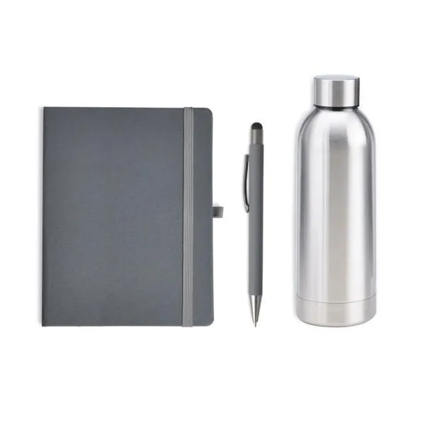 Composto por garrafa prata com dupla parede de Inox; caderno para anotações cinza com capa dura e caneta esferográfica em alumínio cinza.
