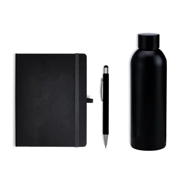 Composto por garrafa preta com dupla parede de Inox; caderno para anotações preto com capa dura e caneta esferográfica em alumínio preta.
