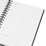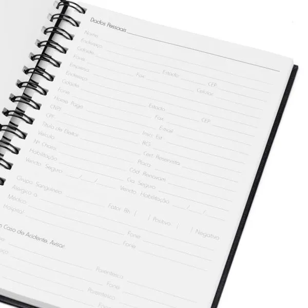 Conta com garrafa em aço inox branca com tampa rosqueável, caderno para anotações wire-o preto com capa dura e caneca em cerâmica branca.