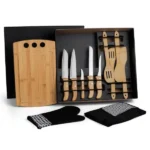 Composto por tábua com 3 furos, colher, colher perfurada, espátula perfurada e espátula quadrada de 30 cm em Bambu; faca 7″, faca santoku, faca para pão e faca para legumes em Bambu/Inox; faca 5″ para desossar em Madeira/Inox; luva e avental em Brim.