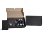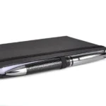 Conta com uma caderneta de 80 folhas preto; porta-cartão em material sintético preto texturizado e metal cromado para aproximadamente 20 cartões; caneta esferográfica em metal com corpo revestido em material sintético preto texturizado; chaveiro em metal com material sintético preto.