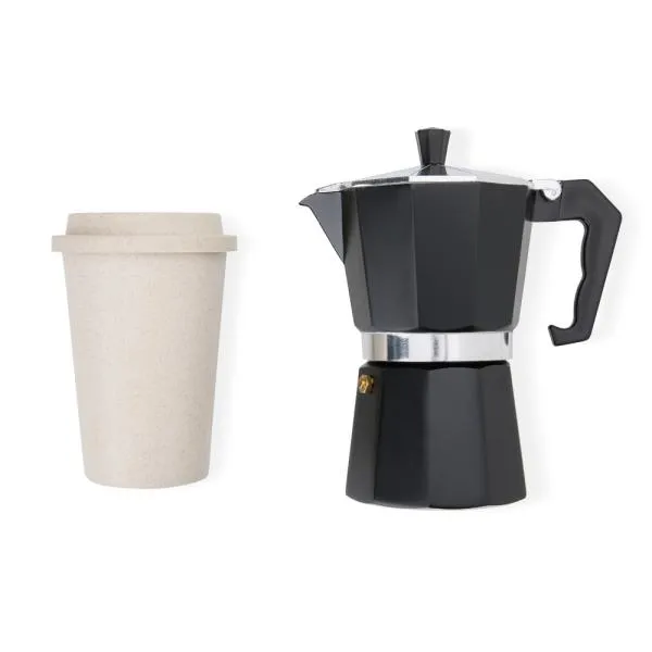 Kit para café. Composto por cafeteira modelo Italiana em alumínio de alta qualidade e resistência e copo em Fibra de Bambu / PP.