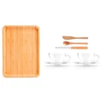 Kit para Cafézinho/Chá. Composto por bandeja, espátula e duas colheres em Bambu. Acompanha também duas xícaras com pires em vidro.