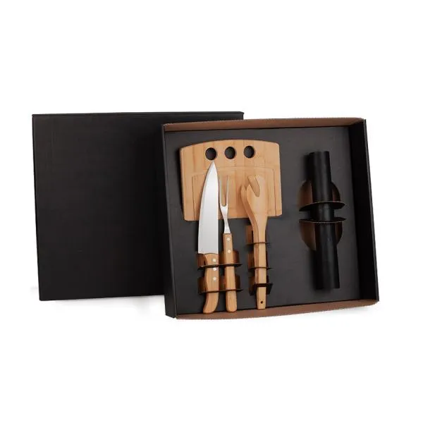 Kit para Churrasco. Composto por tábua retangular com três furos e pegador 30cm em Bambu; garfo trinchante em Bambu/Inox; faca 8″ e garfo trinchante em Madeira/Inox. Acompanha também esteira Grill antiaderente em PTFE que funciona como chapa 40x30cm.
