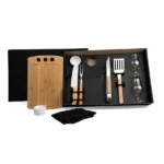 Kit para Churrasco/Hambúrguer/Cerveja. Composto por tábua em Bambu com três furos; garfo trinchante, faca 8″, pegador e espátula perfurada em Madeira/Inox; avental em Brim preto; dois ramekins em porcelana e duas taças para Cerveja em vidro.