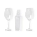 Kit composto por coqueteleira em plástico PS (poliestireno) com tampa, coador, dosador em ml e oz. Conta também com duas taças em vidro com capacidade de 490 ml cada uma.