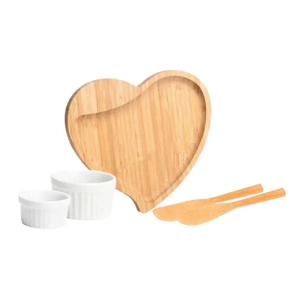 Kit para petisco com petisqueira em formato de coração e duas espátulas 14cm em bambu; Dois ramekins, um pequeno e um mini em porcelana.