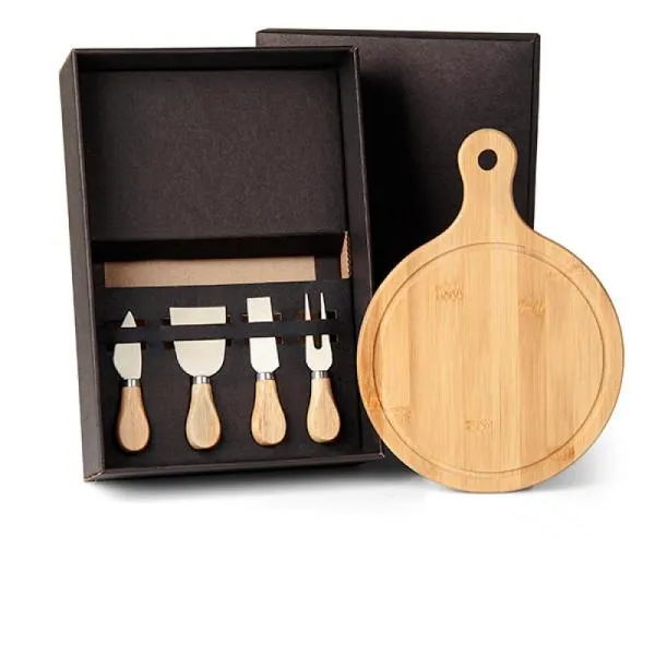 Composto por tábua com alça para queijo/petisco em bambu; duas facas, sendo, uma com ponta e outra reta, garfo e espátula em Madeira/Inox; Estão perfeitamente acomodados em uma caixa para presentear.