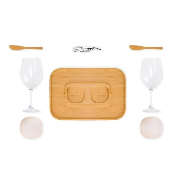 Composto por petisqueira em Bambu com duas cumbucas em Fibra de Bambu; duas espátulas de 14 cm em Bambu; duas taças em vidro para Vinho e um abridor saca-rolhas em aço Inox escovado.