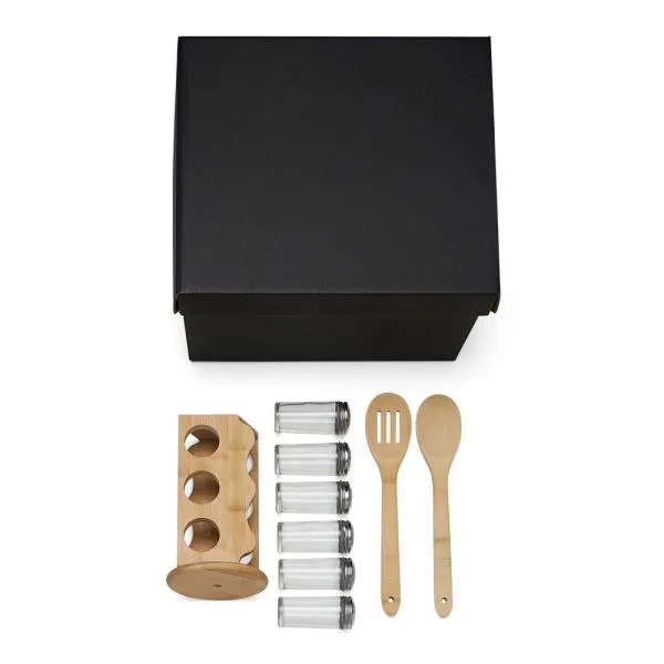 Conta com base, colher e colher perfurada de 30 cm em bambu; 6 potes de vidro com tampa;