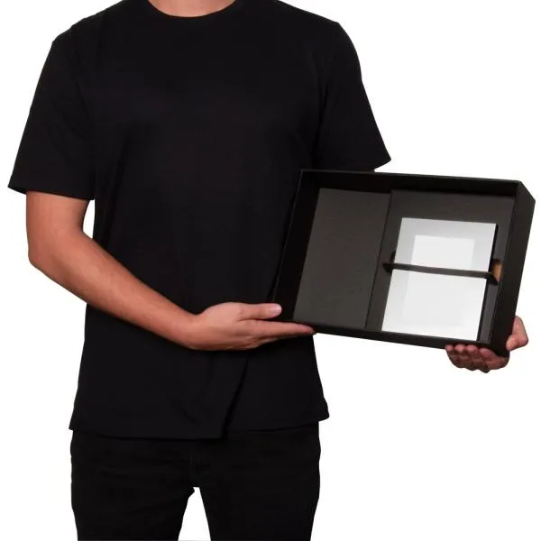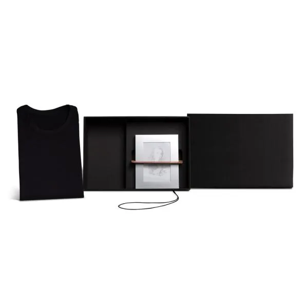 Composto por porta-retrato em alumínio fosco com vidro frontal, apoio em polipropileno preto e uma fina espuma no interior para acomodar melhor a foto. Composto também por camiseta tamanho P.