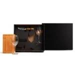 Kit Queijo e Vinho. Composto por tábua retangular para queijo em Bambu; faca 4″ para queijo com cabo em Madeira/Inox e duas taças para Vinho em vidro.