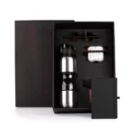 Conta com squeeze em aço inox; fone de ouvido; caderno sem pauta e caneta em plástico ABS prata.