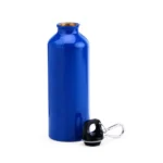 Kit composto por squeeze azul em alumínio revestido com verniz; caneca em cerâmica na cor preta; caderno para anotações azul com capa dura e caneta esferográfica em ABS azul.